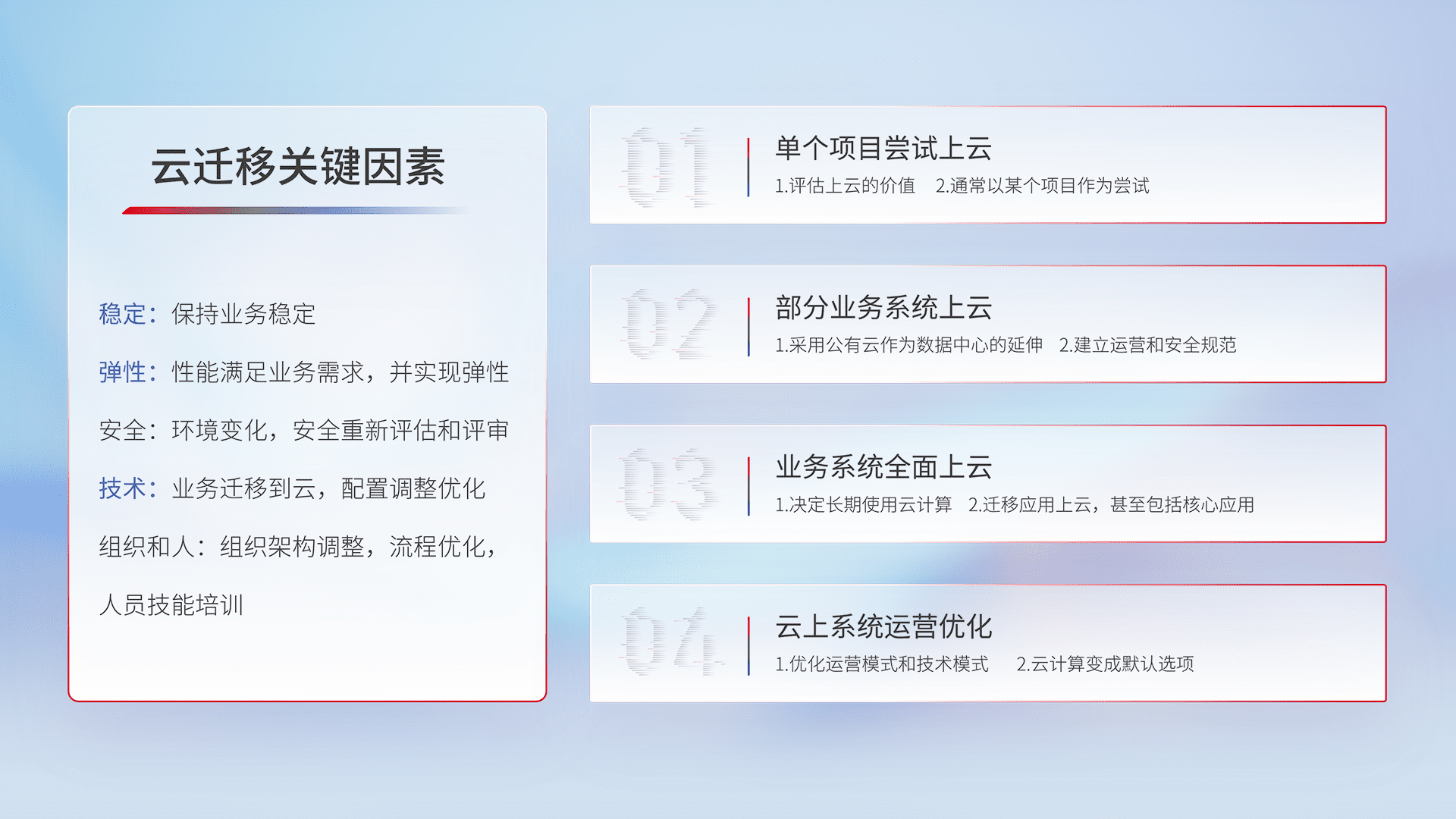 结合实际业务,,,从规划设计、、、云平台选型、、云原生改造、、、数据迁移、、集成交付,,,迁移全过程为客户识别最佳上云路径,,,,做好风险识别管理,,,,设计网络架构、、、身份权限、、安全审计合规、、、操作审计、、日志审计、、监控告警策略、、多站点容灾设计等,,对云上基础设施进行整体规划,,,提升IT治理水平,,,以满足弹性、、、高可用、、、、高性能的需求。。。