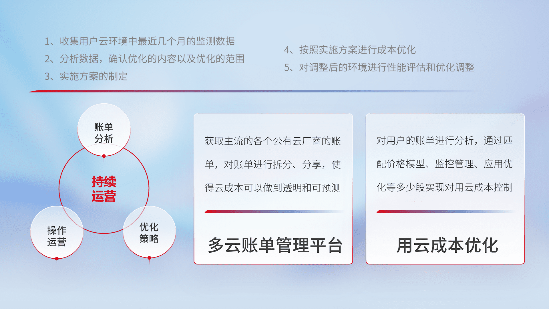通过多云纳管,,,,以统一的资源数据模型把客户的云资源进行抽象和封装,,进而实现对多云资源的统一操作,,,,保障云资源管理的可靠性、、、稳定性与可用性。。。量身定制化运维内容,,,配置、、、、开发运维、、、、补丁管理、、、备份、、、监控、、、、认证和访问管理、、、审计和日常巡检等,,,,保障在用云过程中的可靠度,,,,稳定度以及高可用率。。。。
